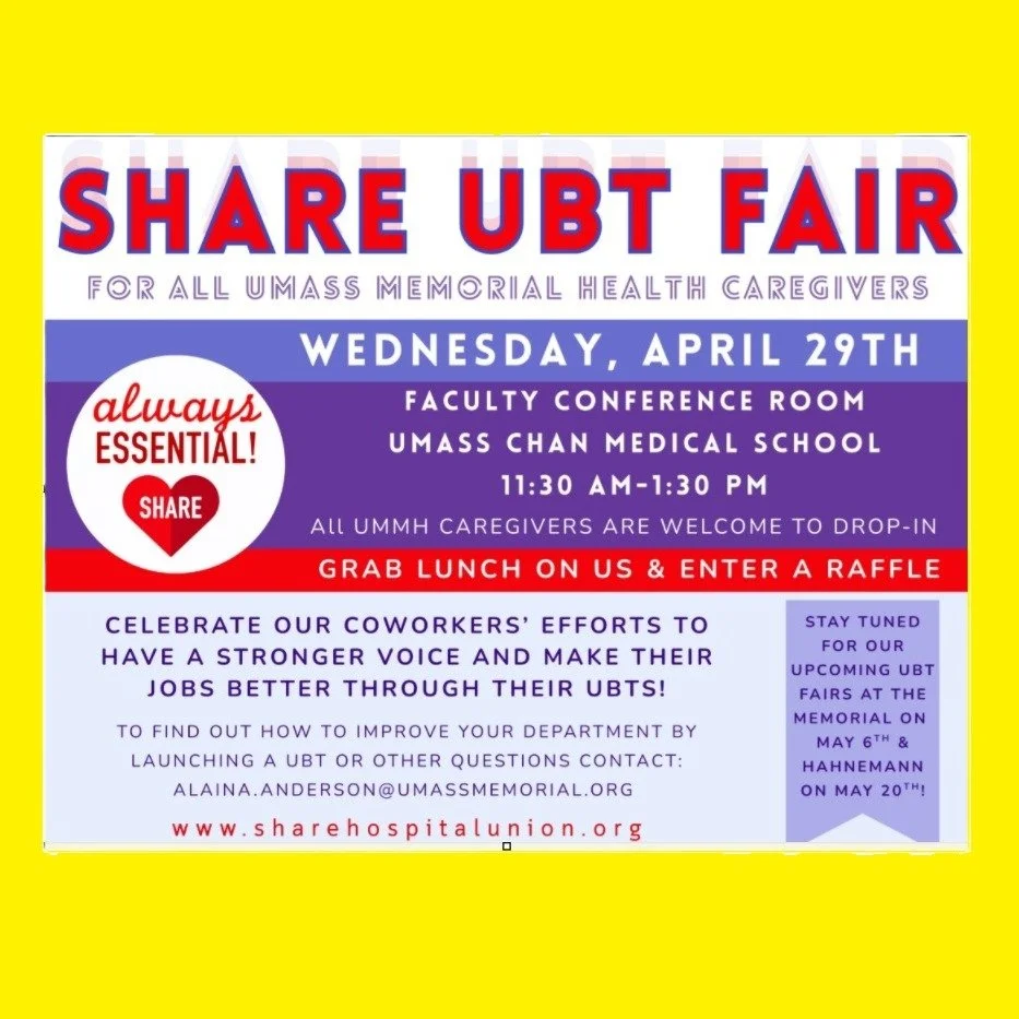 SHARE will meet again this year with UMass Memorial Hospital to negotiate our next Contract agreement — policies, benefits, and raises. We expect some hard conversations. But we know that we can solve any problems the way we always have: making our voice heard, sharing our stories, and staying connected. Here’s what you can do now: