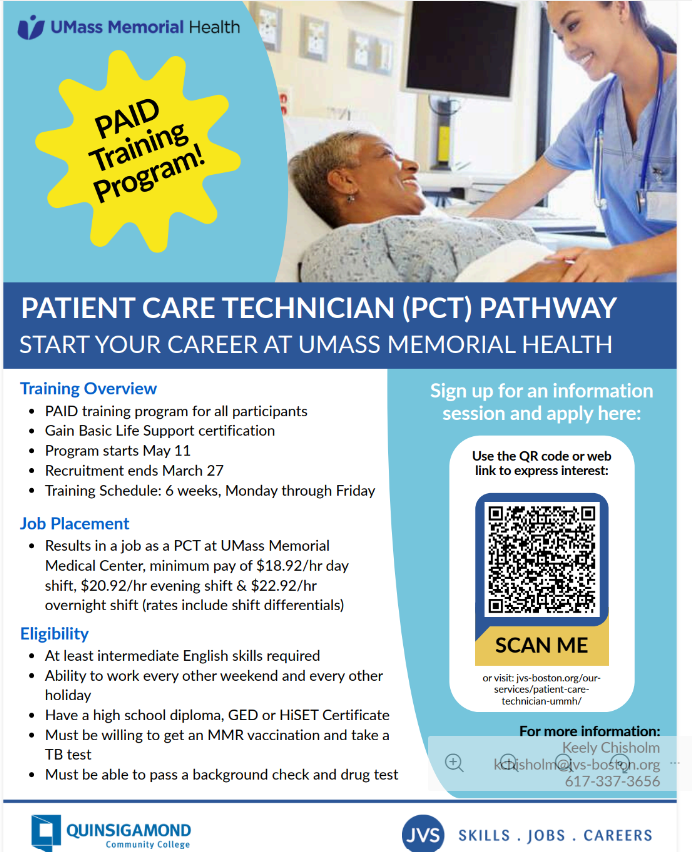 SHARE and UMass Memorial are thrilled to announce the recruitment for the fourth and fifth cohorts for the Patient Care Technician (PCT) Pathway Program! This is a fantastic opportunity for prospective candidates to gain new skills while earning a salary! For more details, see the flyer below