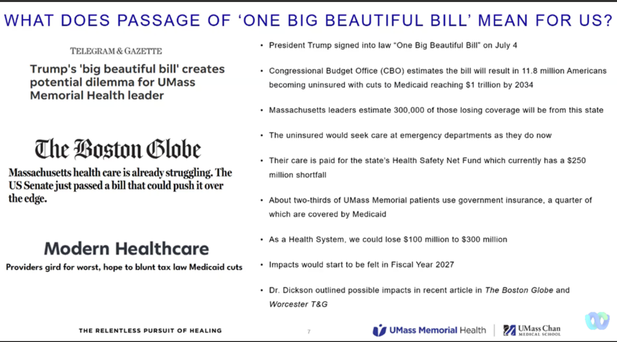 Dr. Dickson’s message (from “The Thread” on October 9th), outlines measures to further address these issues in FY26, and to stem the projected impacts of the One Big Beautiful Bill Act on safety net hospitals like our own. Dr. Dickson also praised the work of UMass Memorial employees toward those cost savings through the Find the 4% initiative, an effort to re-calibrate hospital finances by enhancing revenue and decreasing spending throughout the system.