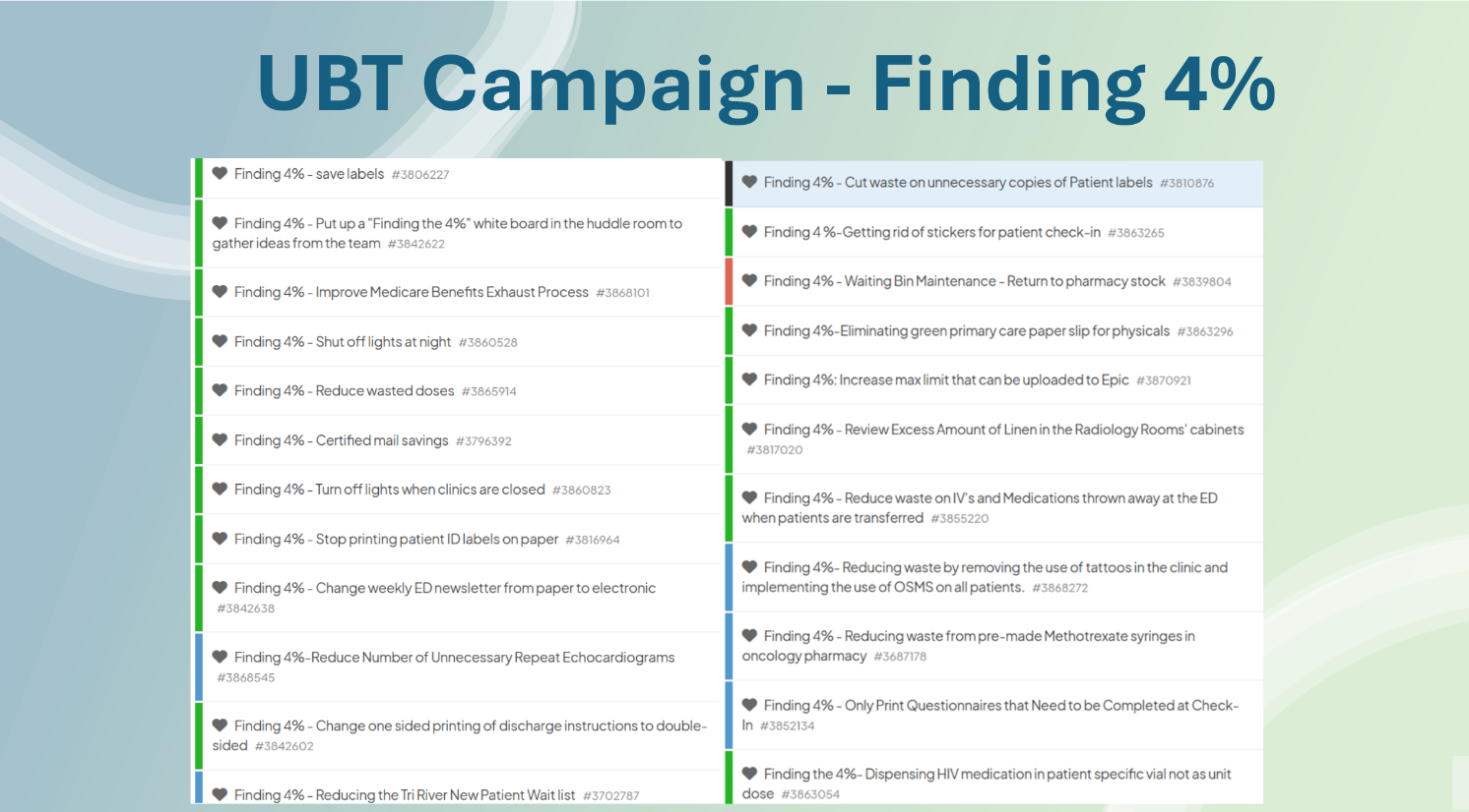 Recently, SHARE Unit Based Teams have turned some attention to the hospital’s “Finding 4%” campaign. UBTs give SHARE members opportunities to design the work in their own departments, and put SHARE members at the center of the decision-making about things that matter to them. The purpose of UBTs is to make it feel better to come to work, and to make it easier to be able to do work we can feel proud of. Here’s a glimpse of some of the UBT projects to “Find 4%”: